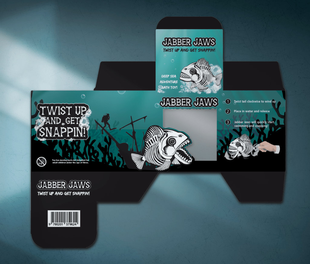 Introducing Jabber Jaws, a captivating mock-up toy packaging design featuring a wind-up skeleton fish toy that snaps its… Read More
